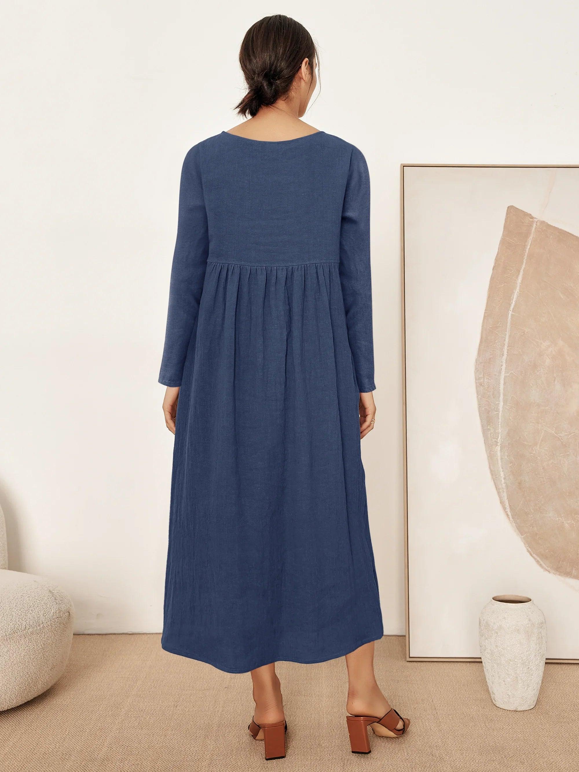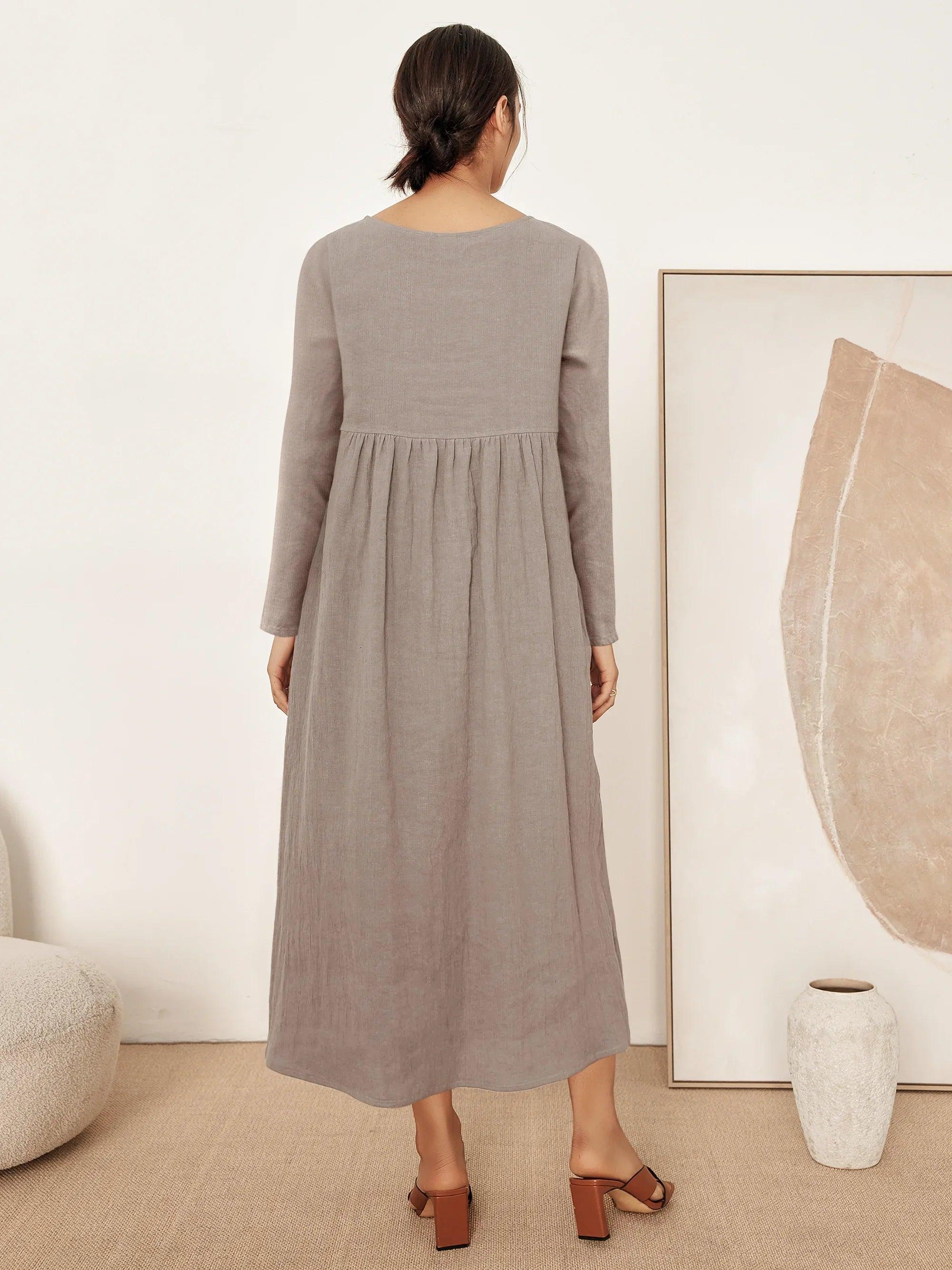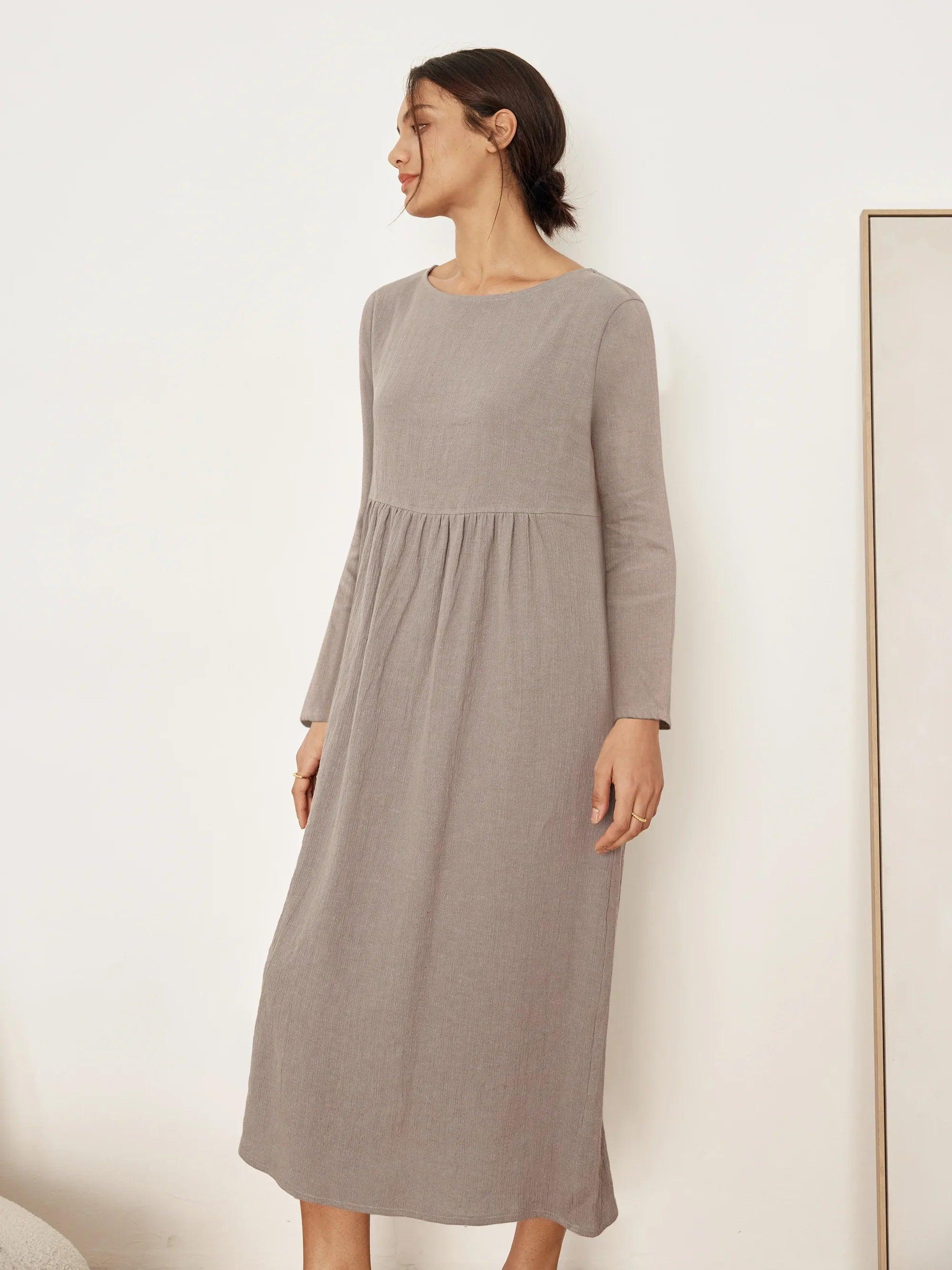 JANETTE 100% Linen Long-Sleeve Pleated Maxi Dress