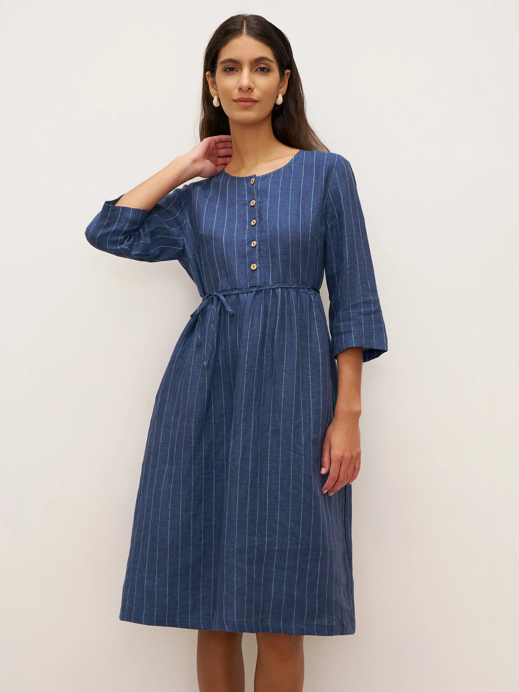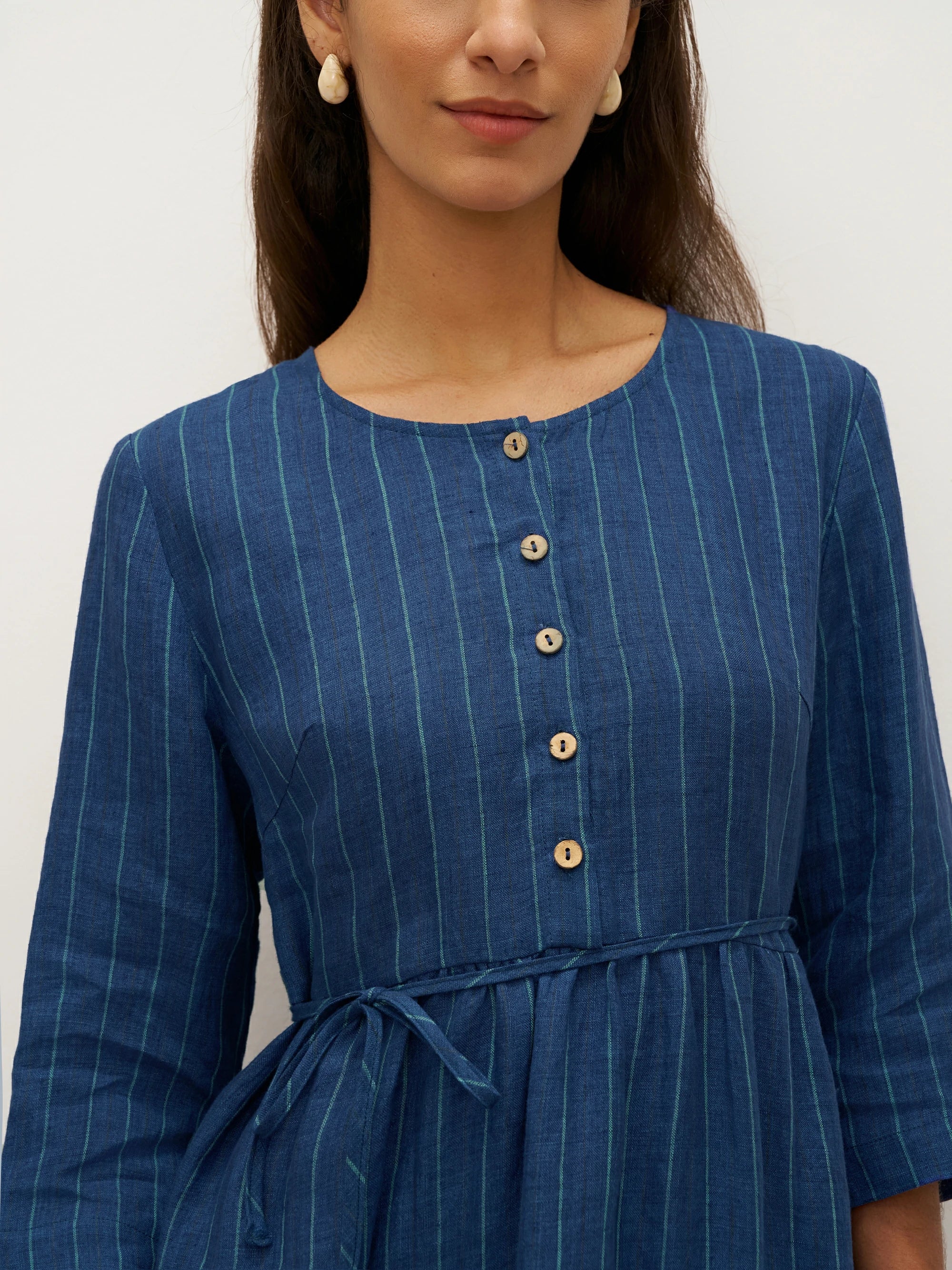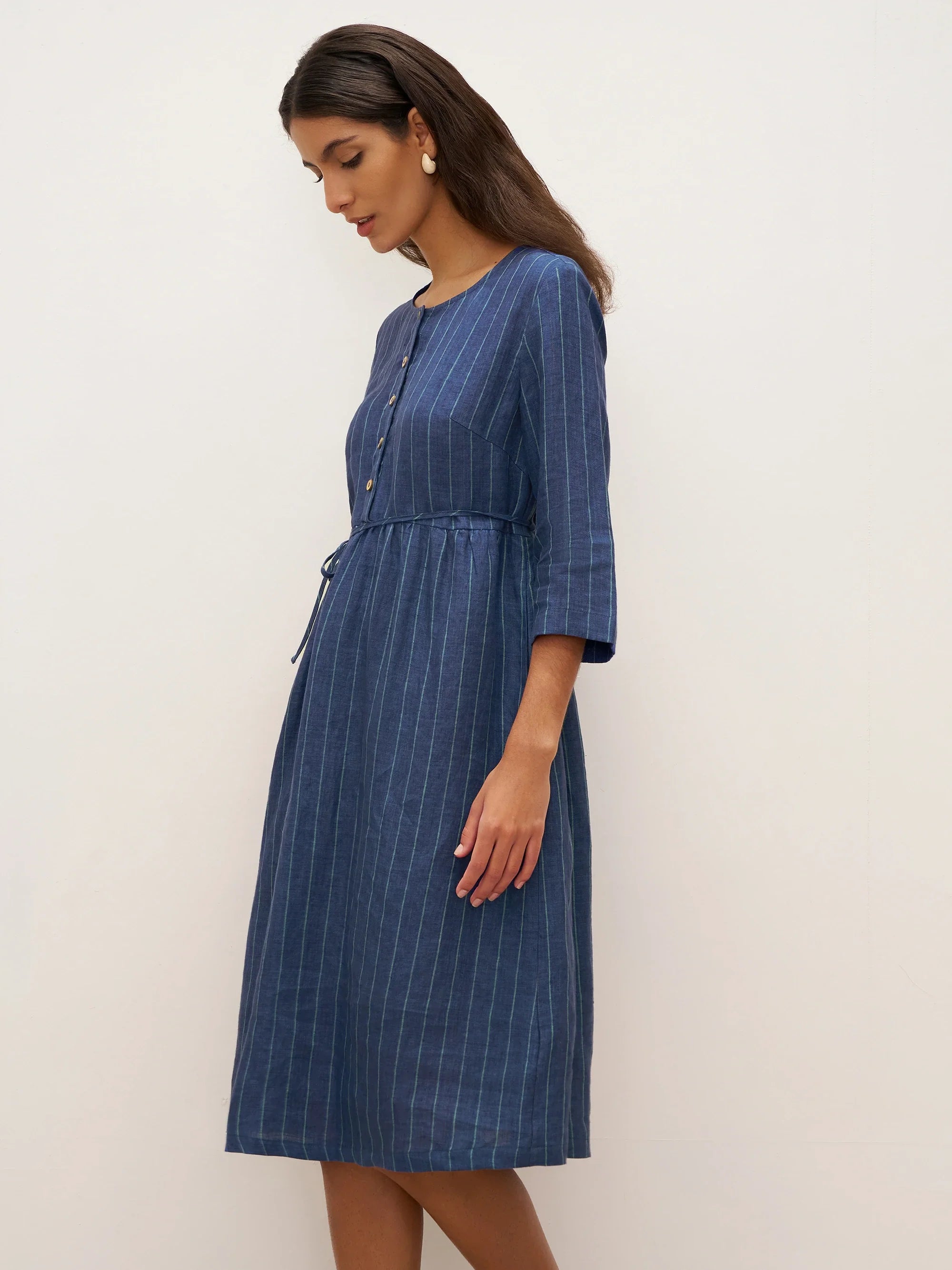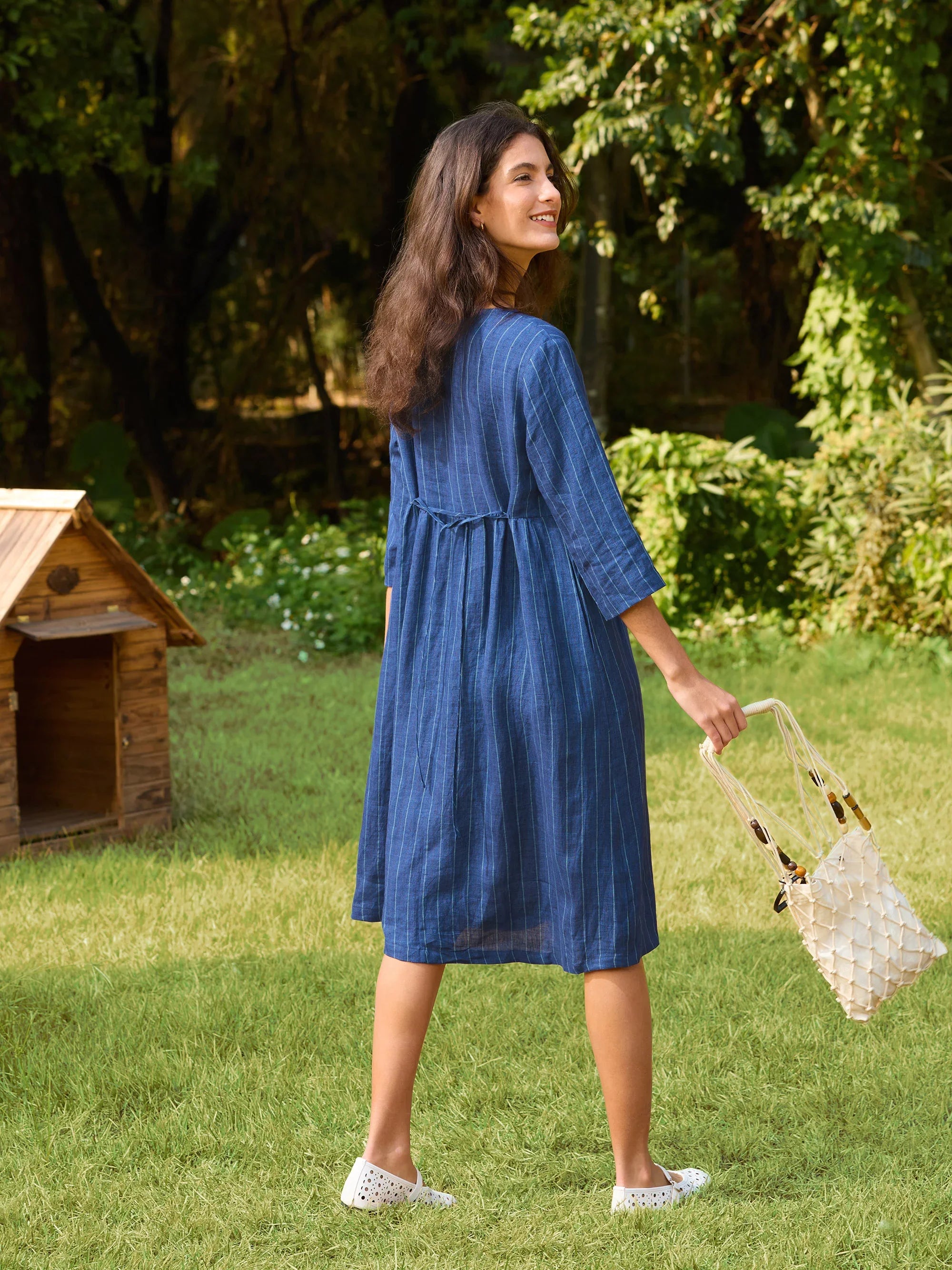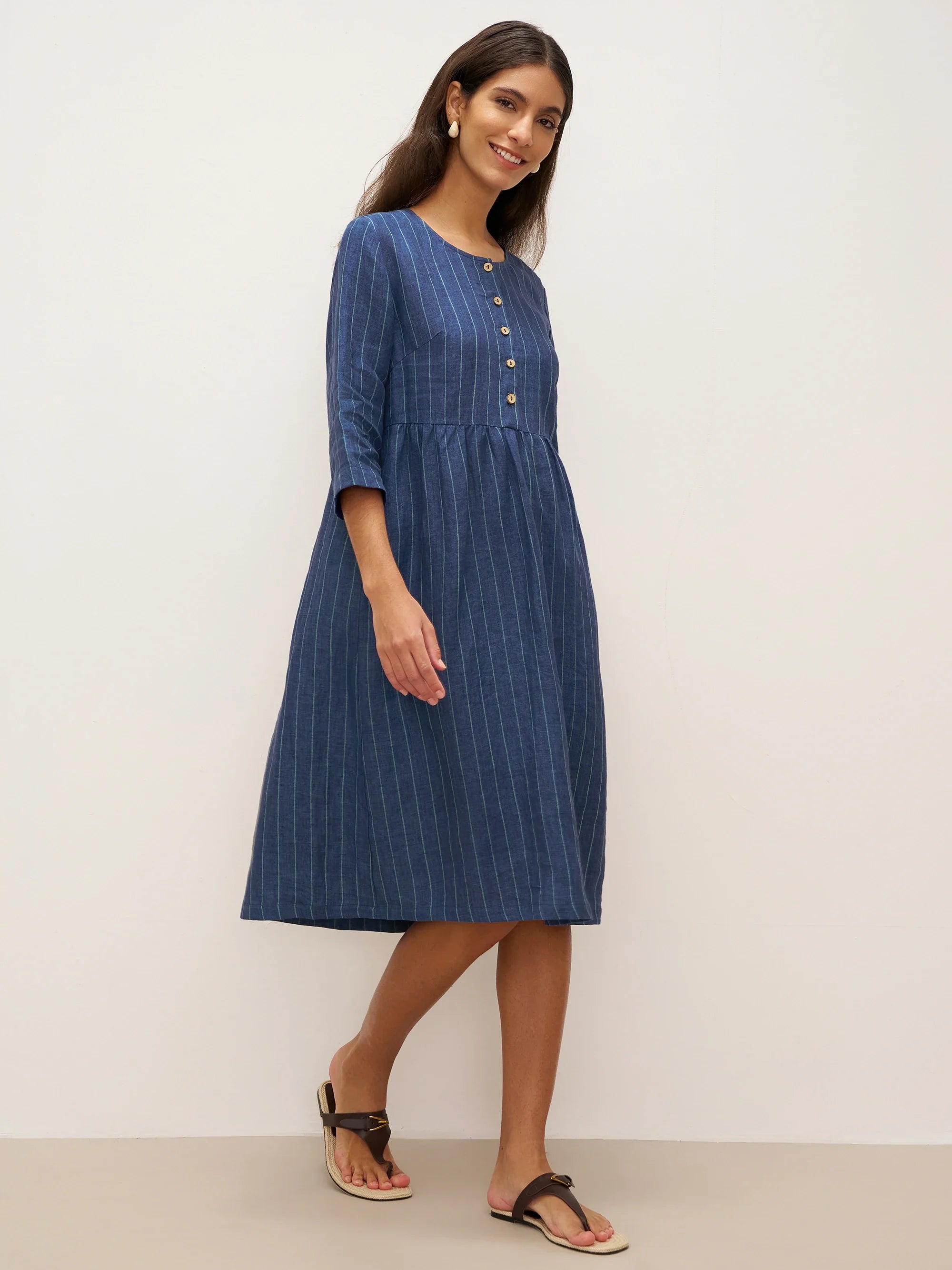 This dress features classic striped patterns that highlight the unique natural feel of linen and beautifully showcase a vintage-inspired style with timeless charm.