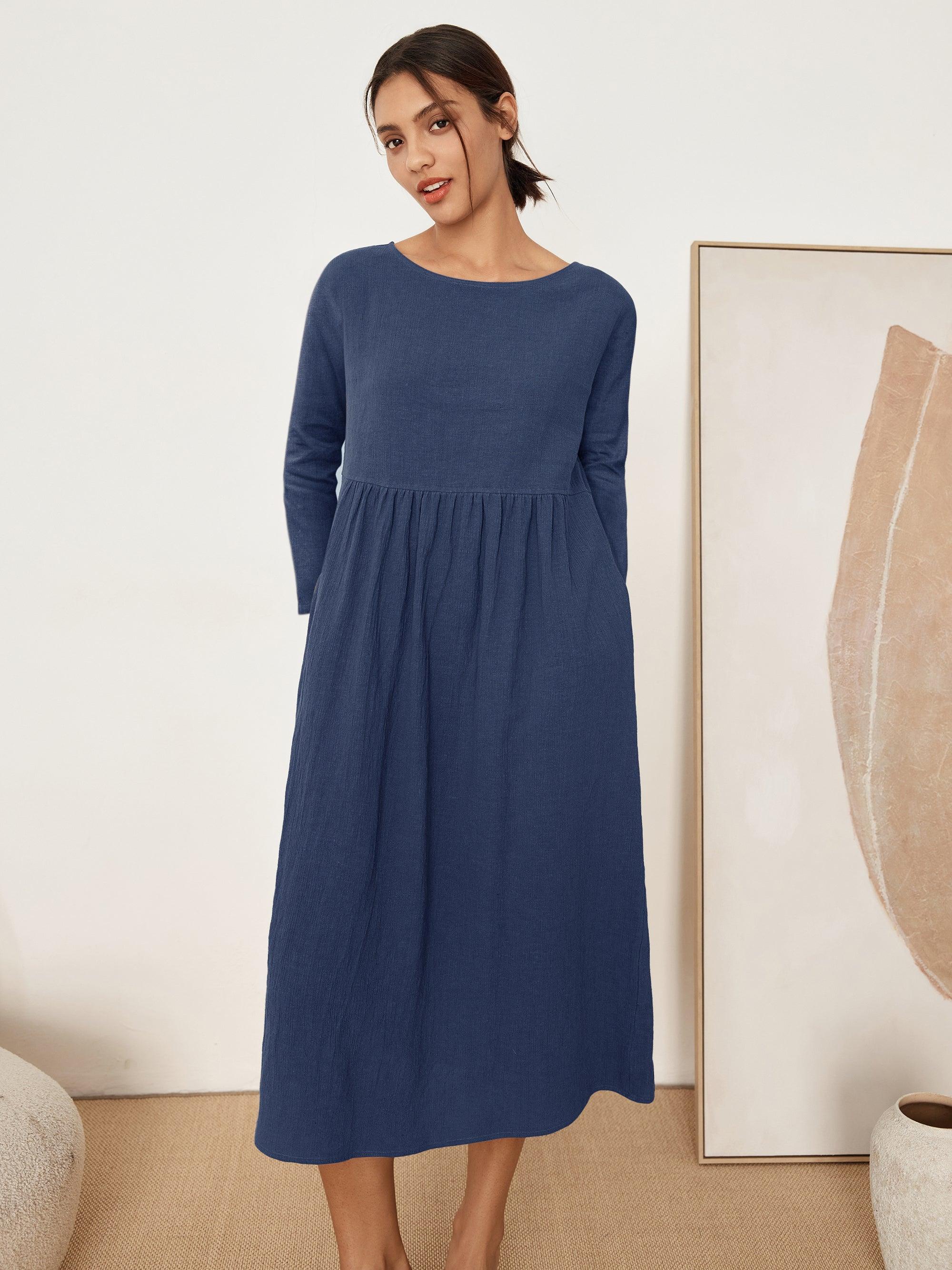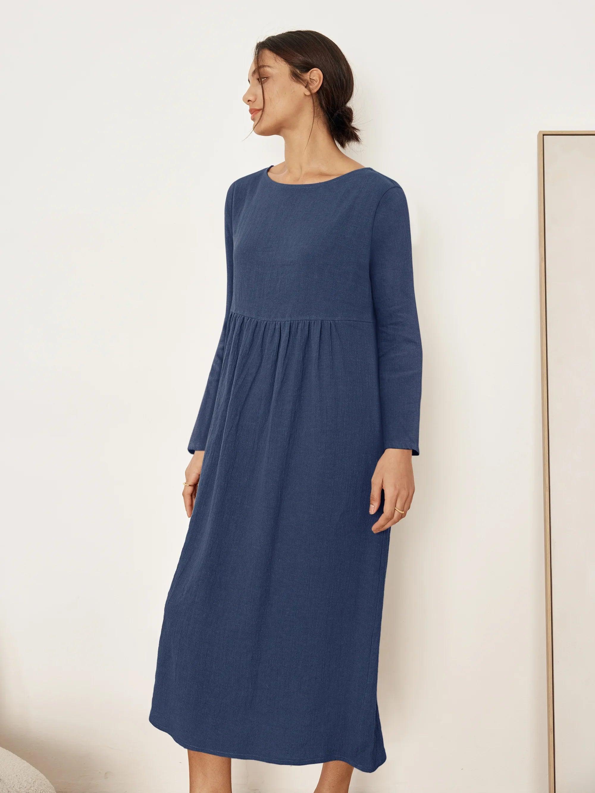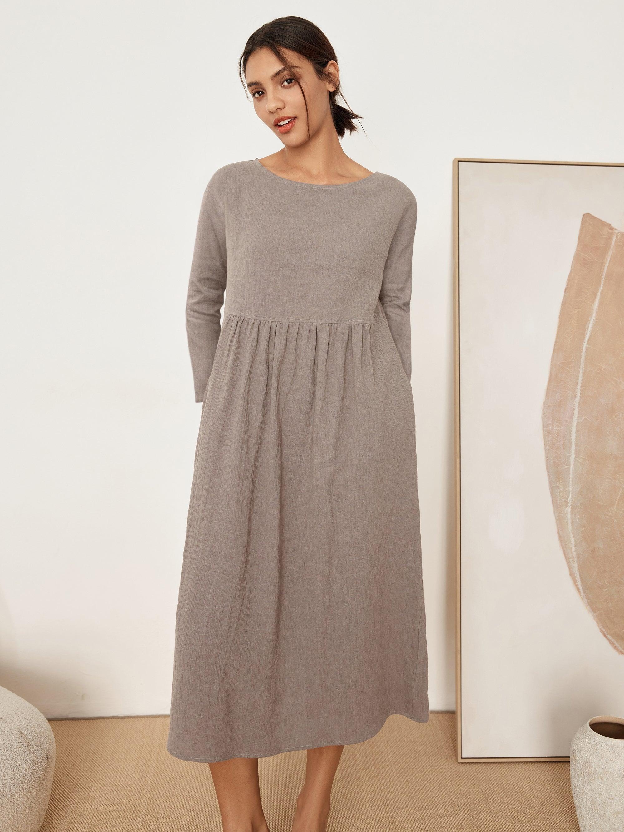 JANETTE 100% Linen Long-Sleeve Pleated Maxi Dress