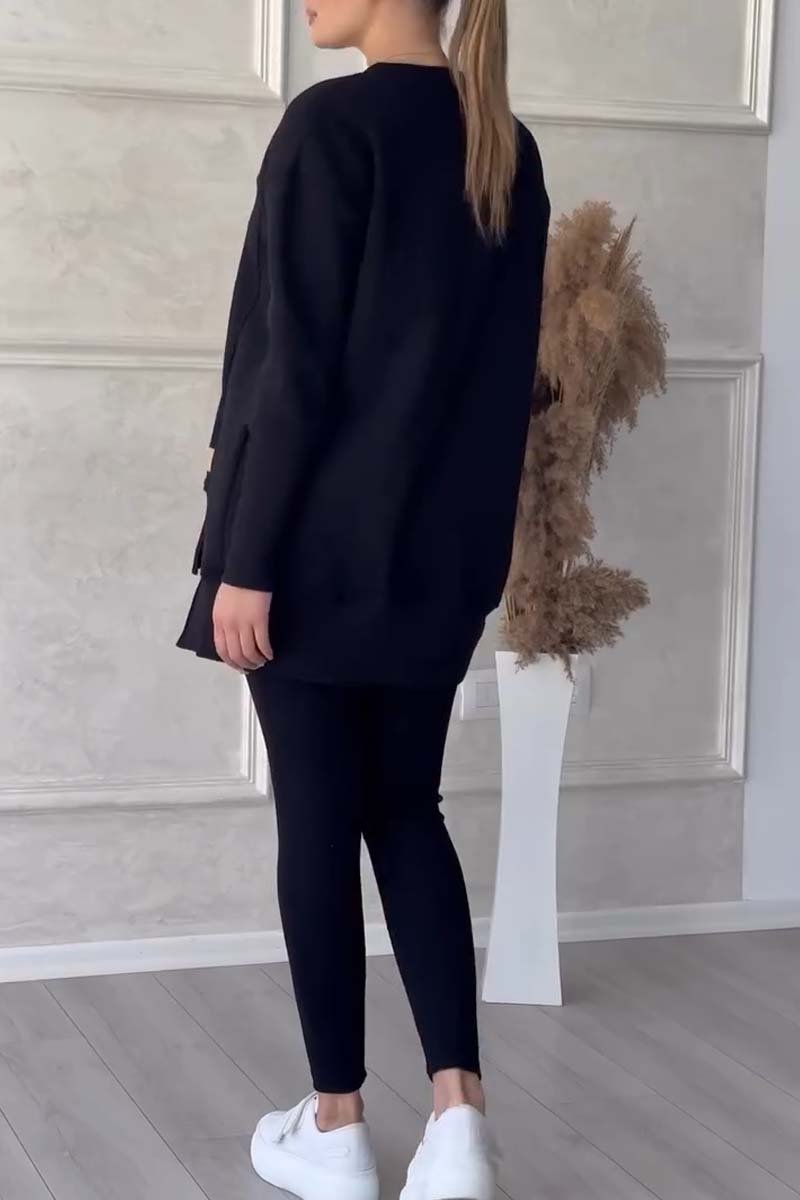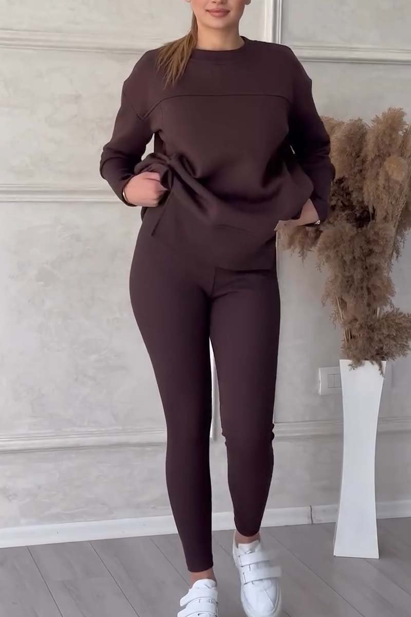 (without tags)Women's Casual Solid Color Round Neck Long Sleeve Slit Hem Sweatshirt Leggings Set